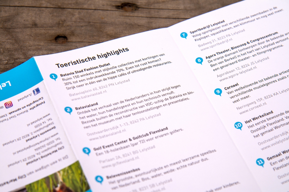 Voor City Marketing Lelystad maken wij al meerdere jaren de stadsplattegrond. Naast een actuele stratenkaart staat op de achterzijde een toeristische overzichtskaart waar alle unieke plekjes op worden aangegeven, zoals Batavialand, natuurgebied De Marker Wadden en meer actieve locaties als de surfschool en het Belevenissenbos. Een handige kaart voor zowel locals als toeristen.